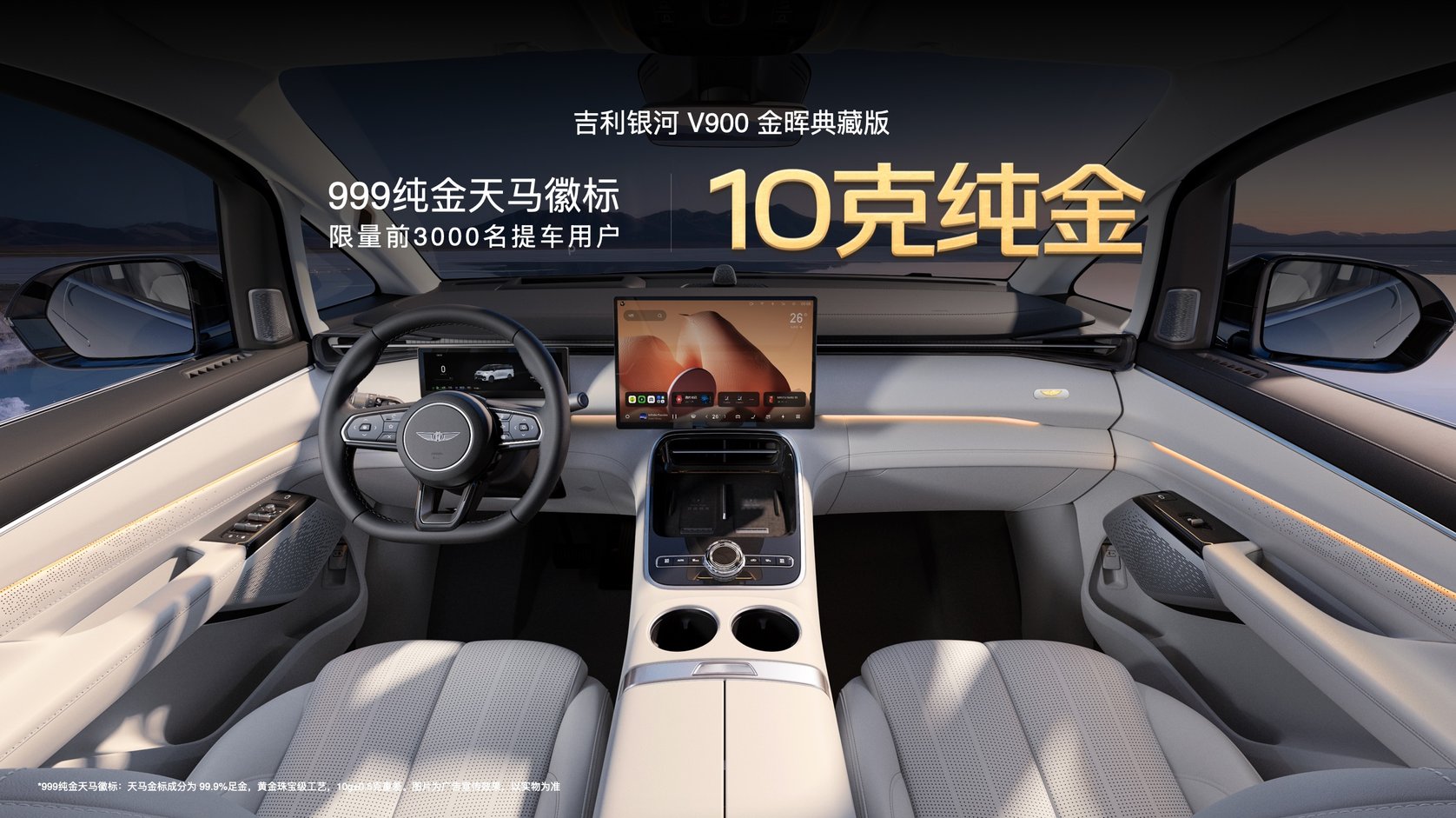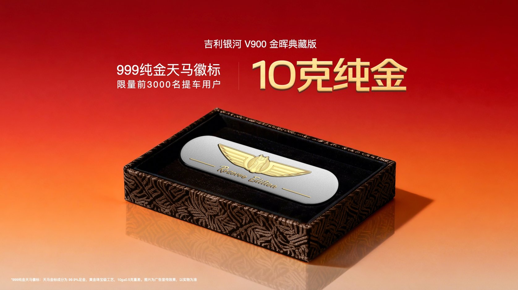 吉利銀河V900有一個特殊的版本叫金暉典藏版。前3000名金暉典藏版提車用戶,吉利銀河免費送10克999純金天馬徽標(biāo)。