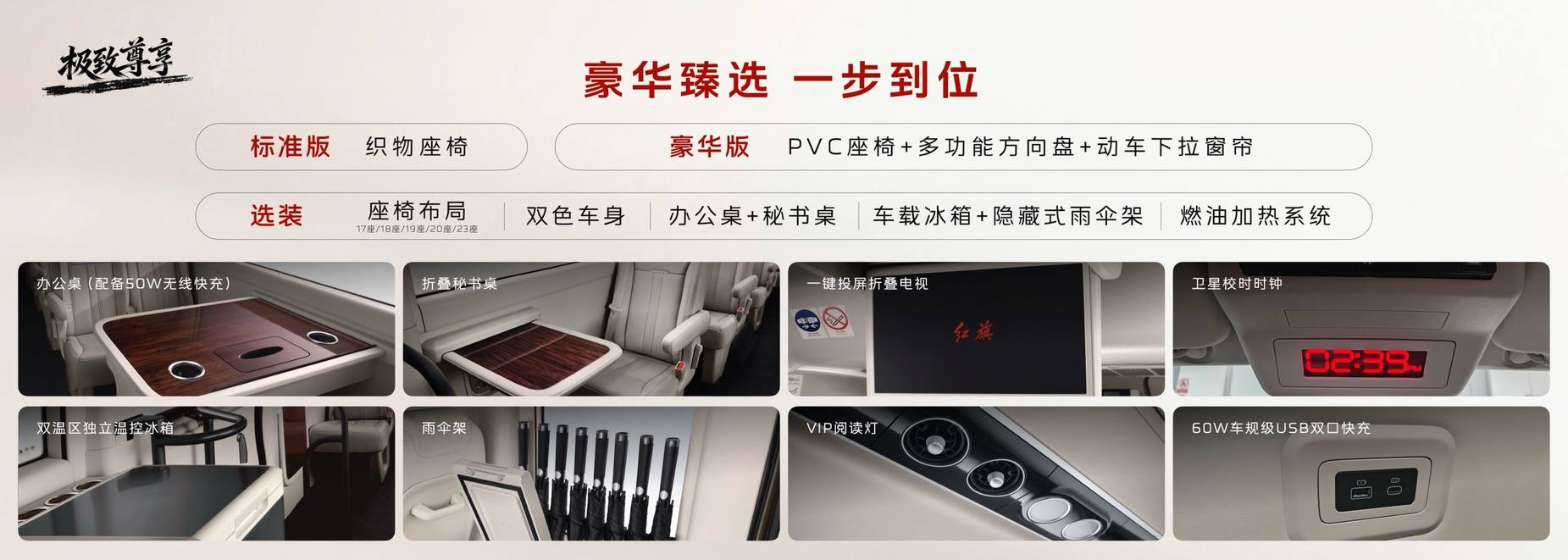 此外,營運專屬一鍵投屏折疊電視、60W車規級USB雙口快充、衛星信號毫秒級自動校時時鐘等配置,充分滿足娛樂與辦公需求。針對不同出行場景,紅旗金葵花國悅營運版還提供了豐富的個性化選裝,提供包括集成50W無線快充的辦公桌、車載冰箱、雨傘架等豐富原廠選裝配置。