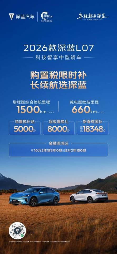 同時,深藍L06以滿滿誠意推出多重購車福利,大幅降低智能座駕擁有門檻。消費者購車即享5000元購置稅補貼、至高5000元換購福運禮、至高18228元新春國補,金融方案可享10萬5年貸3年0息或8萬2年貸0息。年輕消費者無需背負高額資金壓力,就能輕松入手這款顏值與續航兼備的智能轎跑。