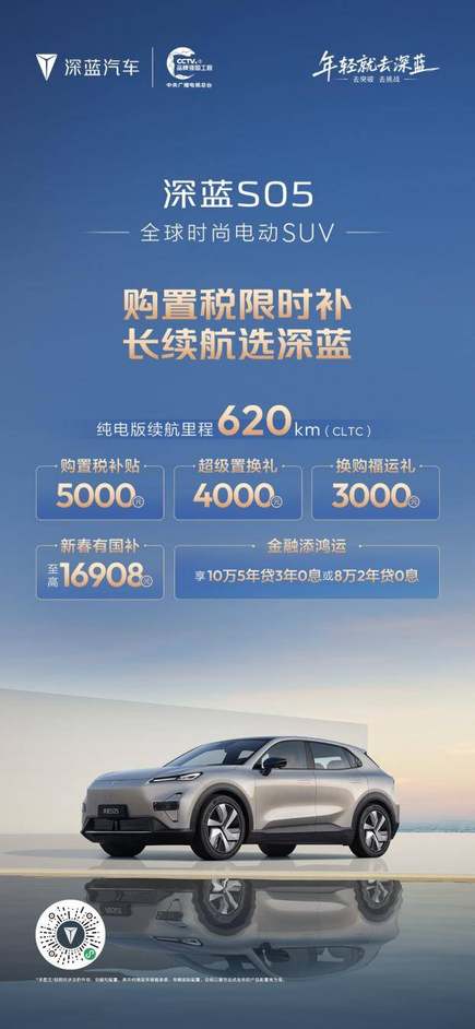 為回饋用戶厚愛,現在下訂深藍S05,可享5000元購置稅補貼、4000元超級置換禮、3000元換購福運禮、至高16908元新春國補,金融方案同樣提供10萬5年貸3年0息或8萬2年貸0息選擇。無論是首次購車還是置換升級,消費者都能享受到實打實的優惠,質價比優勢突出。