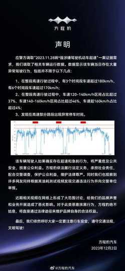 2023 年 12 月,方程豹豹 5 上市之際,姚某強通過抖音賬號“大秦軍陜團”發布視頻,聲稱以正常駕駛方式測試方程豹旗下車型豹5,得出百公里油耗18升的結論,在網絡上引起了大范圍的關注及討論。之后應警方調查取證需要,比亞迪調取數據顯示:測試當日車輛存在大量異常駕駛行為,高速行駛過程中有3個時段車速超過180km/h, 有6個時段車速超過170km/h,在整段高速行駛過程中,車速120-140km/h區間占比超過37%,車速140-160km/h區間占比超過46%,車速超160km/h占比超過4%。