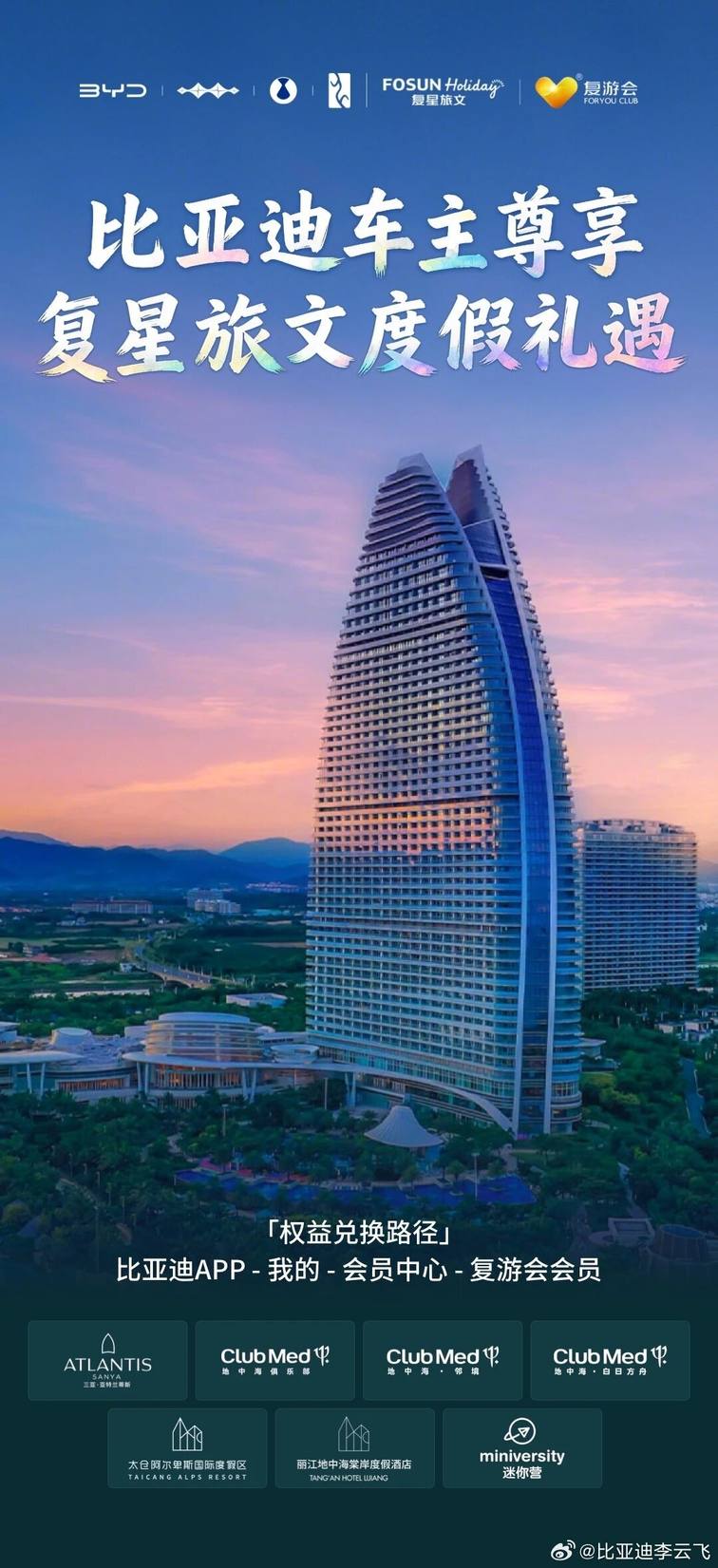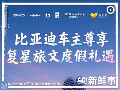 比亞迪與復星簽署戰略合作協議僅一個月,雙方首個合作項目便正式落地,比亞迪車主權益生態再擴圈:為千萬車主定制專屬旅行度假權益,讓出行之外的生活,更添品質與驚喜!