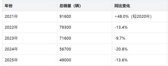 作為對比,2021年-2025五年間,林肯汽車在華分別銷售9.16萬輛、7.93萬輛、7.16萬輛、5.67萬輛和4.9萬輛,整體呈逐漸下滑走勢。這五年中僅2021年是增長狀態,同比增長48%,這也是林肯近幾年銷量的巔峰時期。