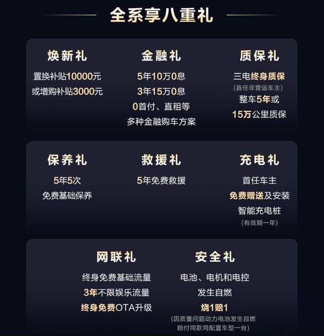 第八重,安全禮:電池、電機和電控發(fā)生自燃,燒1賠1(因質量問題動力電池發(fā)生自燃賠付同款同配置車型一臺)。