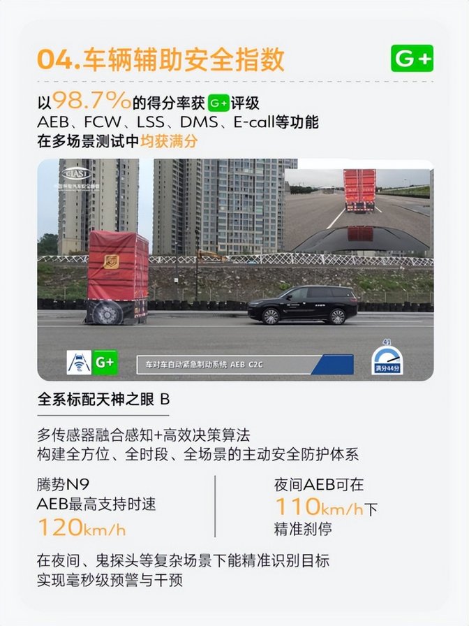 智能安全領(lǐng)域,騰勢(shì)N9同樣展現(xiàn)出高端車型的領(lǐng)先水準(zhǔn)。其車輛輔助安全分指數(shù)以G +評(píng)級(jí)通過測(cè)評(píng),騰勢(shì)N9以高達(dá)98.7%的得分率獲G+評(píng)級(jí),AEB、FCW、LSS、DMS、E-call等功能在多場(chǎng)景測(cè)試中均獲滿分。騰勢(shì)N9搭載天神之眼B輔助駕駛激光版,基于多傳感器融合感知與高效決策算法,構(gòu)建了全方位的主動(dòng)安全防護(hù)體系。其自動(dòng)緊急制動(dòng)(AEB)、前方碰撞預(yù)警(FCW)、車道保持輔助(LKA)及駕駛員狀態(tài)監(jiān)測(cè)(DMS)等功能,在多場(chǎng)景測(cè)試中均獲滿分,實(shí)現(xiàn)縱向與橫向的全方位風(fēng)險(xiǎn)規(guī)避。該系統(tǒng)更融合了超遠(yuǎn)距高感知視覺單元,支持在夜間、鬼探頭等復(fù)雜環(huán)境下,仍能精準(zhǔn)識(shí)別行人、車輛及障礙物等目標(biāo),完成毫秒級(jí)預(yù)警與干預(yù)。同時(shí),通過電子穩(wěn)定控制系統(tǒng)(ESC)、自動(dòng)遠(yuǎn)近光切換等多重安全配置,為用戶提供覆蓋全速域、全場(chǎng)景、全天候的智能安全守護(hù),從容應(yīng)對(duì)各類駕駛挑戰(zhàn)。