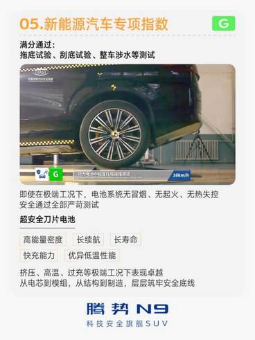 在新能源汽車專項(xiàng)指數(shù)中,騰勢(shì)N9同樣獲得G評(píng)級(jí),拖底試驗(yàn)、刮底試驗(yàn)、整車涉水試驗(yàn)等測(cè)試滿分通過。這不僅證明了其在電池防護(hù)與電驅(qū)安全上的硬實(shí)力,更從“碰撞極端場(chǎng)景”到“日常用電安全”雙維度,徹底打消了用戶對(duì)電動(dòng)車安全的顧慮。