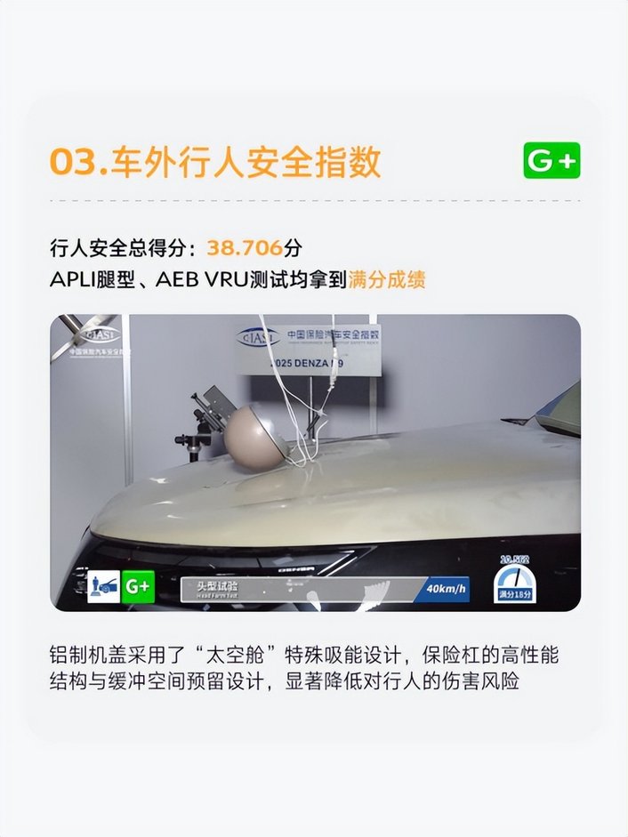 真正的安全,應(yīng)該是全方位的安全考量。騰勢(shì)N9獲得車外行人安全分指數(shù)G +評(píng)級(jí),行人安全總得分為38.706分,APLI腿型、AEB VRU測(cè)試均拿到滿分成績(jī)。這源于騰勢(shì)N9鋁制機(jī)蓋采用了“太空艙”特殊吸能設(shè)計(jì),保險(xiǎn)杠的高性能結(jié)構(gòu)與緩沖空間預(yù)留設(shè)計(jì),顯著降低對(duì)行人的傷害風(fēng)險(xiǎn),將安全從車內(nèi)延伸至車外,讓每一次出行都增添一份安心。