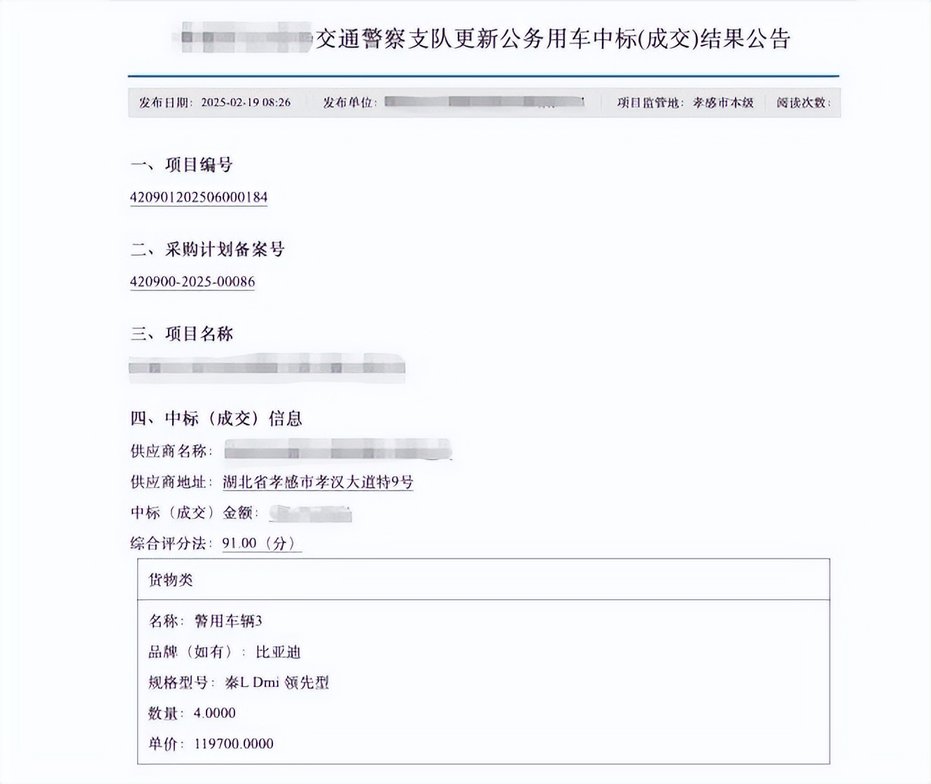在全國多地政府的實際采購中,比亞迪已成為警車隊伍中的“高頻面孔”。公開的政府采購公告顯示,安徽合肥、遼寧錦州、陜西西安、湖北孝感,再到貴州黔南,多地公安系統(tǒng)的警車采購項目中都出現(xiàn)了比亞迪旗下車型的身影。這些車型覆蓋了秦PLUS、宋Pro、宋PLUS等多款主力產(chǎn)品,應(yīng)用于日常巡邏、刑事偵查等多種執(zhí)法執(zhí)勤場景。