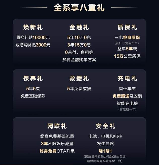 第八重,安全禮:電池、電機(jī)和電控發(fā)生自燃,燒1賠1(因質(zhì)量問(wèn)題動(dòng)力電池發(fā)生自燃賠付同款同配置車(chē)型一臺(tái))。