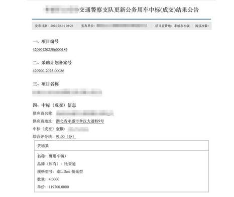 在全國多地政府的實際采購中,比亞迪已成為警車隊伍中的“高頻面孔”。公開的政府采購公告顯示,安徽合肥、遼寧錦州、陜西西安、湖北孝感,再到貴州黔南,多地公安系統的警車采購項目中都出現了比亞迪旗下車型的身影。這些車型覆蓋了秦PLUS、宋Pro、宋PLUS等多款主力產品,應用于日常巡邏、刑事偵查等多種執法執勤場景。