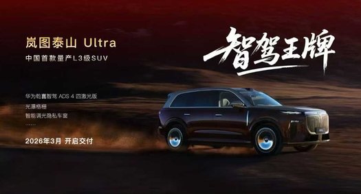 核心殺手锏是全系標配L3級智駕硬件,綁定華為技術加持,目標直指30-50萬高端新能源市場。打頭陣的泰山Ultra,作為國產首款量產L3級SUV,3月交付(45.99萬起),搭載華為乾崑ADS 4四激光雷達,關鍵系統多重冗余兜底,配智駕狀態燈適配L3試點法規,安全感拉滿。