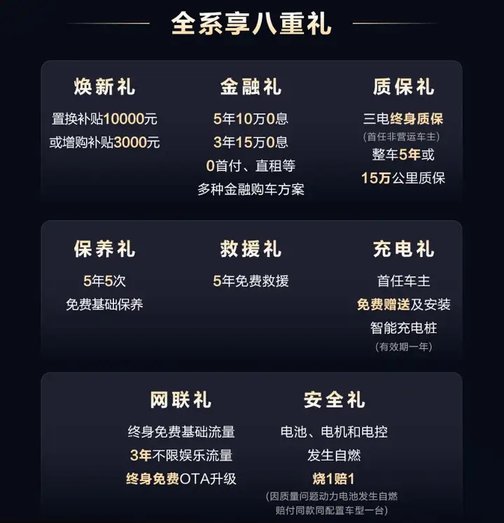 第八重,安全禮:電池、電機(jī)和電控發(fā)生自燃,燒1賠1(因質(zhì)量問題動(dòng)力電池發(fā)生自燃賠付同款同配置車型一臺(tái))。