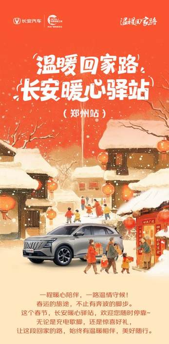 與此同時,長安汽車“溫暖回家路·長安暖心驛站”即日起將陸續在全國五大城市接力開啟,構筑貫穿春運的溫暖動線:鄭州 | 1.24-2.2 鄭州客運北站·正門前廣場,廣州 | 1.26-2.4 廣州南汽車站·東門(近客運站小廣場),上海 | 1.30-2.8 上海長途汽車客運總站·中興路站前廣場,北京 | 2.2-2.11 北京四惠樞紐站·站場院北側,重慶 | 2.2-2.11 重慶北站南廣場汽車站·站前廣場。