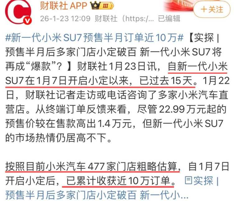 根據財聯社1月23日的報道,新一代小米SU7已經累計收獲接近10萬訂單。