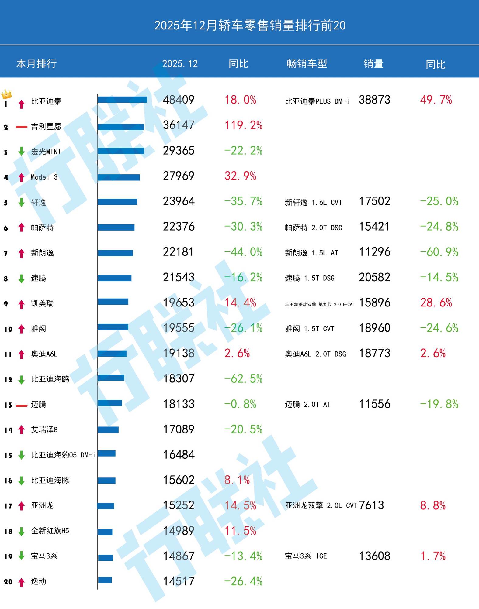 排行前20中,正增長只有8款,其中比亞迪秦發力,銷量48409輛,同比增長18%,沖上第一;吉利星愿銷量36147輛,同比增長119.2%;Model 3銷量27969輛,同比增長32.9%;負增長中,五菱宏光MINI銷量29365輛,同比增長-22.2%,相較于11月的56756輛,近乎腰斬,同比也從正增長變成負增長,據分析,五菱宏光MINI銷量下滑核心是政策補貼退坡、同級競品擠壓、用戶需求升級與年末市場節奏變化疊加所致。比亞迪海鷗銷量18307輛,同比增長-62.5%,持續八個月同比下降,據分析,下降的核心原因是同級競品精準圍剿、產品迭代滯后、用戶需求升級、政策紅利消退與品牌戰略傾斜疊加所致。