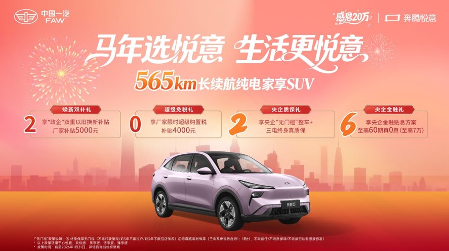 如今,春節(jié)的腳步日益臨近,購(gòu)車需求也進(jìn)入旺季。一汽奔騰奔騰悅意新年歡樂(lè)購(gòu)活動(dòng)截至2026年1月31日,四重真保障福利限時(shí)放送。無(wú)論是追求純電通勤的便捷,還是向往電混出行的無(wú)界,悅意03與悅意07都能滿足你的期待。馬年選悅意,不僅能享受央企品質(zhì)與誠(chéng)意福利,更能讓生活因便捷出行而更添悅意。不妨抓住這一購(gòu)車黃金時(shí)機(jī),走進(jìn)當(dāng)?shù)匾黄简v經(jīng)銷商門店,親身感受悅意系列的硬核實(shí)力與專屬福利,開(kāi)啟屬于你的高品質(zhì)新能源出行之旅。
