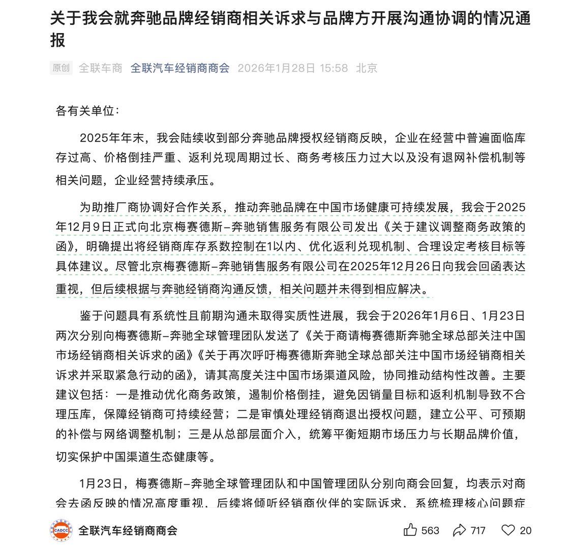從通報內容來看,其反映了近年來奔馳和經銷商之間不斷積累的矛盾,主要集中在銷售目標壓力、庫存積壓、商務政策合理性以及電動車轉型帶來的成本壓力等方面。在奔馳140年的歷史中,這樣的公開“喊話”并不多見,上一次在中國市場還是2018年底20多家福建奔馳經銷商在總部大樓下拉橫幅的聯合“維權”。