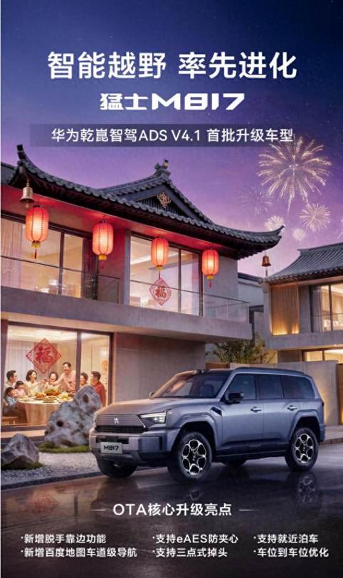 “過了臘八就是年”,如今年味漸濃,不少游子已經滿心期待踏上歸鄉路。1月30日,猛士汽車正式開啟官方OTA升級,猛士M817也成為華為乾崑智駕ADS V4.1首批全量推送車型。憑借智能輔助駕駛功能的煥新與優化,既精準解決了用戶多元場景下的用車痛點,為新春返鄉之旅送上更聰明、更安全、更具溫度的出行守護,更進一步夯實“智能越野第一車”的行業核心標桿地位,持續領跑豪華智能越野新賽道。