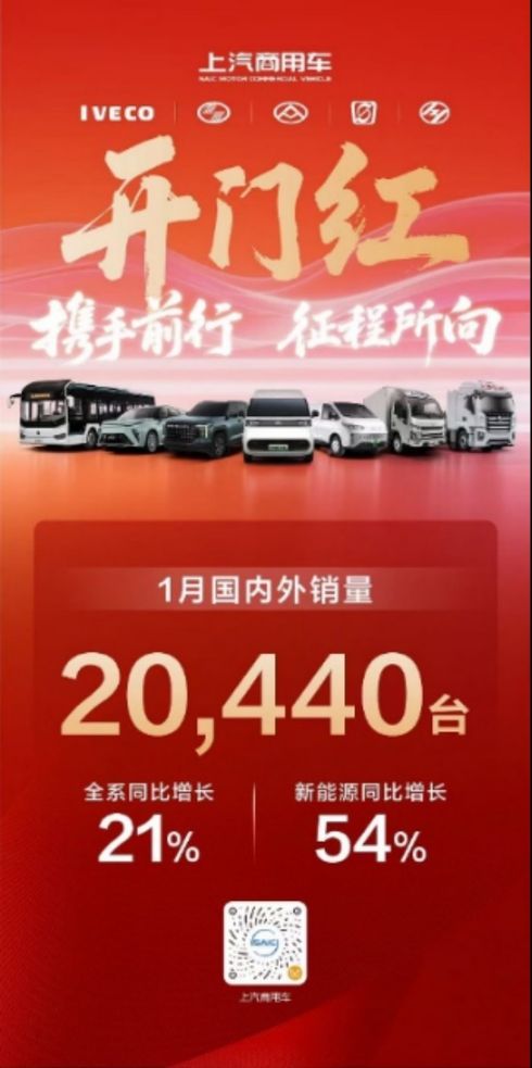 上汽商用車1月實現“開門紅”,全品牌熱銷20,440輛、同比增長21%