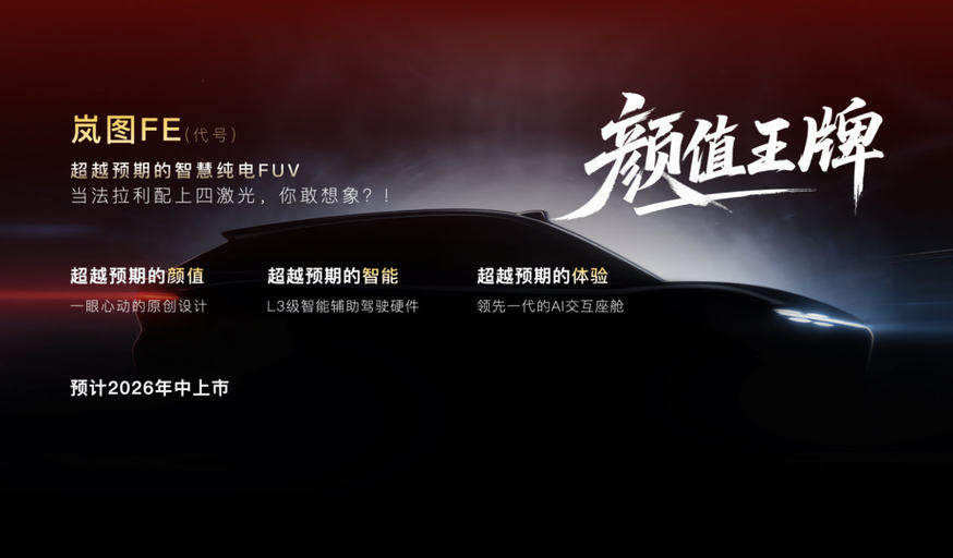 作為超越期待的智慧純電FUV,嵐圖FE(代號(hào))以超越預(yù)期的造型設(shè)計(jì),賦予車型個(gè)性化的情感化表達(dá),滿足年輕用戶獨(dú)特的審美需求。該車型將配備四激光雷達(dá)感知系統(tǒng),搭載L3級(jí)智能輔助駕駛硬件,以及領(lǐng)先一代的AI交互智能座艙,為用戶提供超越預(yù)期的智駕,和超越預(yù)期的AI交互體驗(yàn),并計(jì)劃于2026年年中上市。