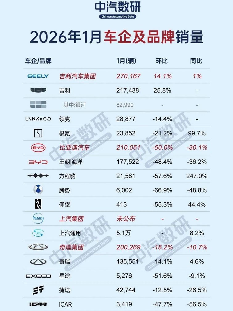 盡管1月的銷量冠軍從比亞迪換成了吉利,但這是比亞迪主動調(diào)整庫存,春節(jié)之后將反擊;盡管多家車企都發(fā)布了同比上漲的海報,但實際上,對比2025年12月,只要環(huán)比下滑低于50%,就是對銷售業(yè)績的肯定。同時還有,合資品牌在進入2026年之后,反而可能迎來小爆發(fā),就比如廣汽豐田1月銷量環(huán)比下滑只有8%,遠(yuǎn)低于同期發(fā)布成績的車企。