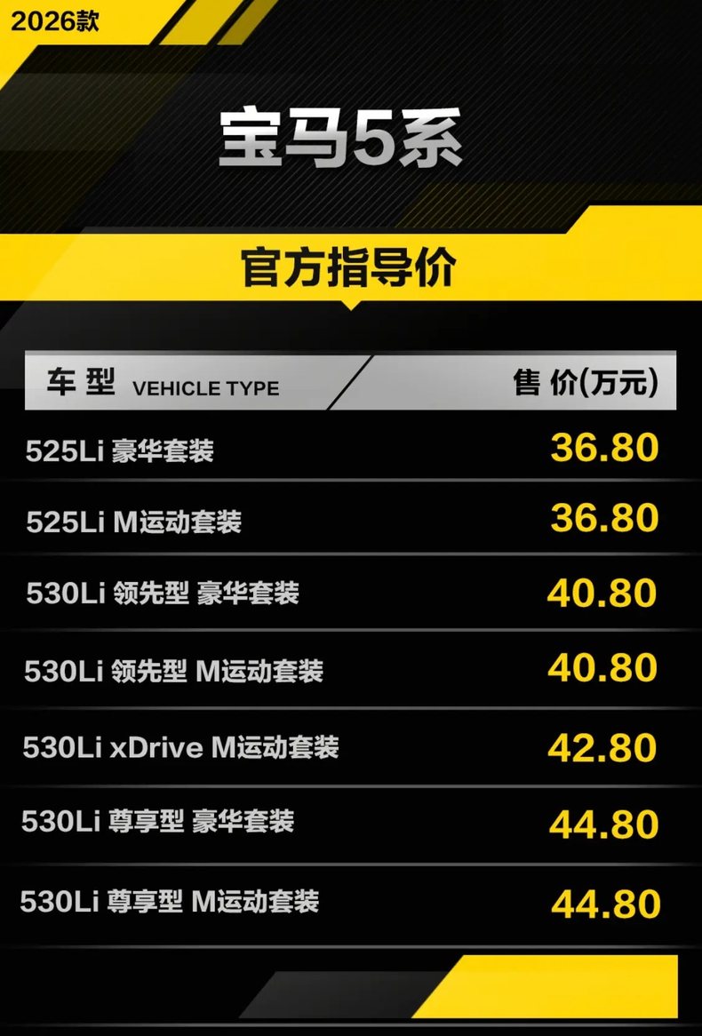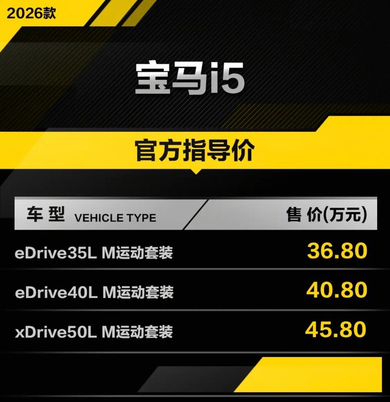 這次新款5系指導(dǎo)價定在36.8萬到44.8萬元,純電的i5則是36.8萬到45.8萬元。大家可能對數(shù)字不敏感,我這么說吧,相比2025款,新車的指導(dǎo)價直接跳水了7到9萬元。我就在想,那些剛提了25款沒多久的車主,看到這個價格估計心里不好受吧。
