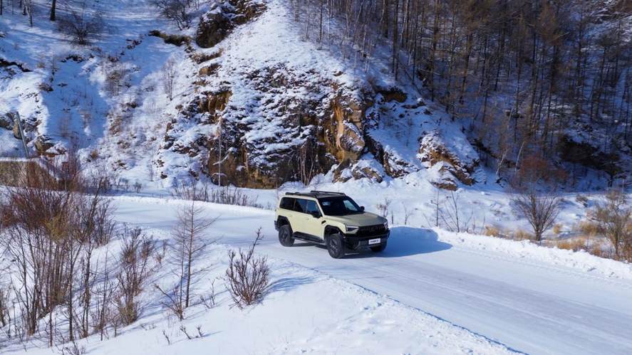 當然,也有極端的情境更顯兇險。為了折騰M817 Hero版,我把它陷入沒過小腿的雪地,這時“深雪”駕駛模式才有用武之地。猛士在關閉ESC輔助系統后,會更精準地通過微調扭矩來驅動車輪,我再打開Hero版獨有的前后機械差速鎖,輕微帶動轉向的同時給油,M817 Hero版如同旱地拔蔥一般,順著松軟的雪花攀爬而上,整個動作行云流水。