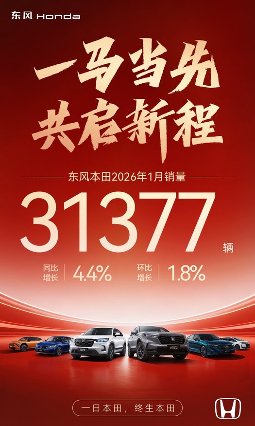2026年,中國汽車市場進入存量競爭的深水區。在復雜的市場環境下,東風本田依托CR-V、HR-V、英仕派、思域四款王牌全球車型的持續發力,展現出了強勁的進取之勢,在2026年1月實現終端銷量31377臺,同比增長4.4%,環比增長1.8%;同時旗下CR-V、HR-V、英仕派等主力車型均實現銷量同比大幅增長。1月“開門紅”的成績在行業調整期彰顯了東風本田公司體系的韌性與品牌的底蘊,為全年“固本強基、穩步上行”奠定了堅實基礎。