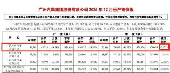 數據顯示,2025年廣汽本田全年銷量為351900輛,同比下滑25.22%,整體銷量下滑的頹勢并未得到扭轉,反而持續承壓。