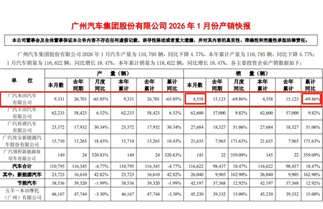 更為尷尬的是,廣汽集團1月份產銷快報顯示,旗下廣汽傳祺、廣汽埃安、廣汽領程三家自主品牌,以及另一合資伙伴廣汽豐田,1月份銷量均實現正增長,唯有廣汽本田銷量暴跌,反而成為拖累集團整體發展的“拖油瓶”,與兄弟品牌的強勢表現形成鮮明反差。