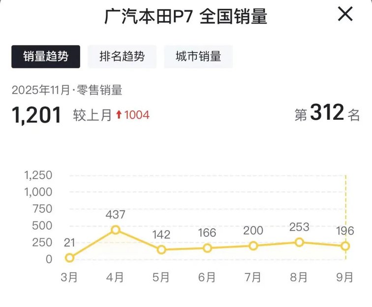 從2025年11月、12月的銷量數據來看,廣汽本田P7銷量雖終于突破千輛,邁入月銷四位數行列,但這樣的成績放在競爭激烈的新能源市場中,依舊難言理想。這也不禁讓人疑問:那些原本等待P7降價后入手的潛在用戶,最終為何選擇了觀望或轉向其它品牌呢?
