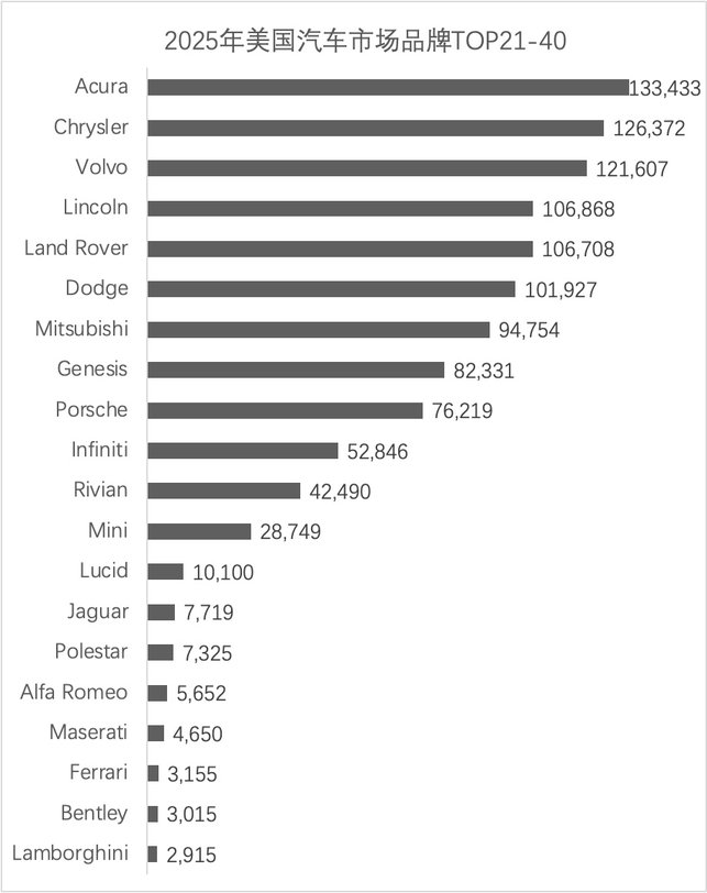類似GMC、斯巴魯、Jeep、特斯拉這些都是50-60萬輛級別。之后則是Ram、馬自達、寶馬、雷克薩斯、奔馳、大眾,年銷量集中在30-40萬輛區(qū)隔。換句話說,要在美國市場進入前十名左右,基本上年銷量要達到60萬輛規(guī)模,這一次就是Jeep恰好超過了60萬輛,而特斯拉下滑13%后僅有54.45萬輛,所以兩者互換了位置。