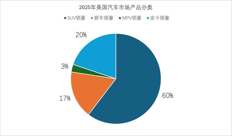 其中SUV車型是美國汽車市場的絕對主力,銷量達到了965.6萬輛,占比高達59.1%,而第二大細分市場是福特F-150所在的皮卡市場,銷售了約380萬輛,市場份額19.5%。之后才是曾經(jīng)的“王者”轎車產(chǎn)品,2025年銷量已經(jīng)下滑到僅為272.2萬輛,占比16.6%。之前一直被認為是三大細分產(chǎn)品的MPV車型在美國市場也是大幅下滑,家用MPV車型銷量大約為43.2萬輛,占比2.6%,另外還有35.5萬輛的商用貨車。