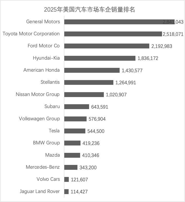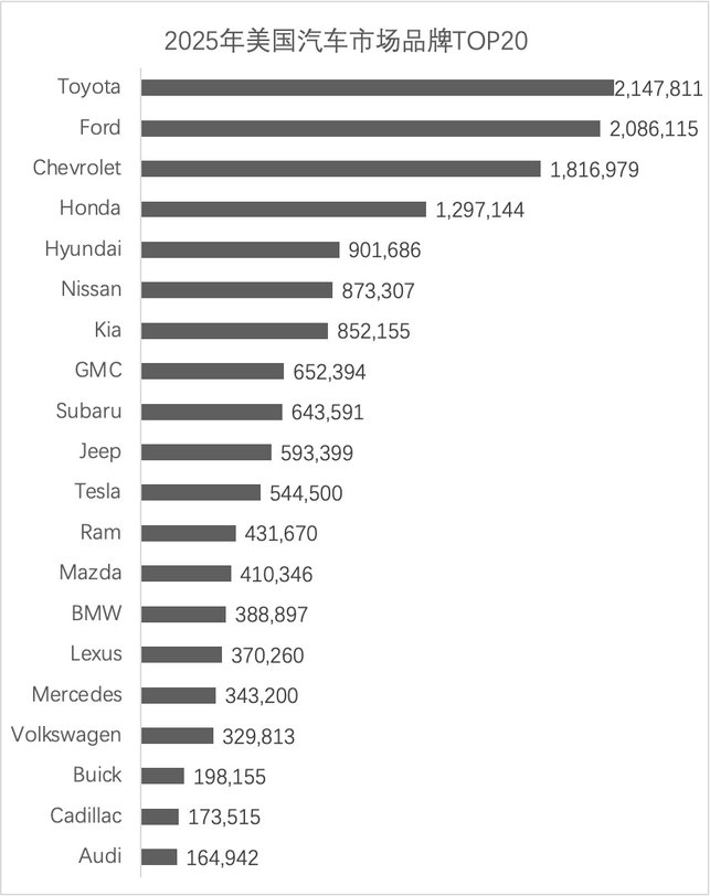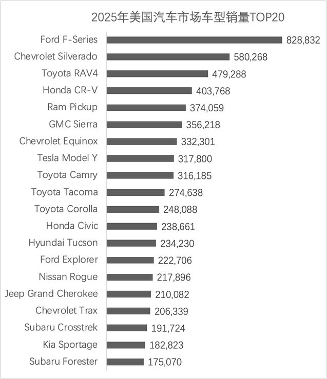 2025年獲得美國汽車市場車企銷量冠軍的是通用汽車,拿下美國汽車市場品牌銷量冠軍的是豐田品牌,而福特F系列皮卡則是全年冠軍,乘用車銷量第一名大概率還是豐田RAV4。