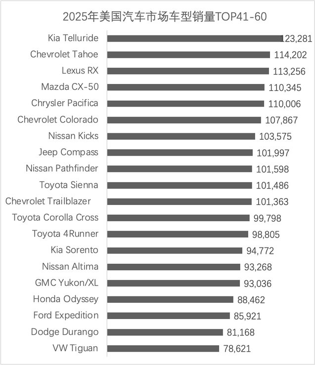 同樣在SUV市場上,豐田RAV4、本田CR-V、雪佛蘭探界者、特斯拉Model Y這些都是30-40萬輛規(guī)模的車型,再算上現(xiàn)代途勝、日產(chǎn)Rogue、福特探險者、Jeep大切諾基這些20萬輛規(guī)模的產(chǎn)品,以及斯巴魯?shù)娜钴囆汀⑵饋喌莫{鉑拓界、雪佛蘭的創(chuàng)界這些15-20萬輛規(guī)模,合計能占到240萬輛、也就是美國汽車市場總量15%的份額。