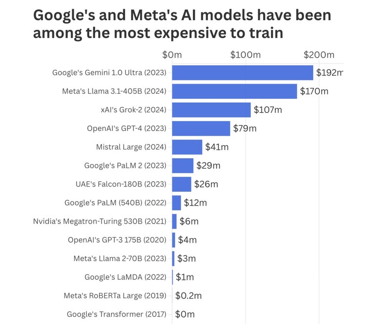 斯坦福大學(xué)人工智能研究所2024年的報(bào)告揭示了這一現(xiàn)實(shí):OpenAI訓(xùn)練GPT-4花費(fèi)了7900萬(wàn)美元;谷歌的Gemini 1.0 Ultra成本為1.92億美元;Meta的Llama 3.1-405B在2024年的構(gòu)建成本為1.7億美元。