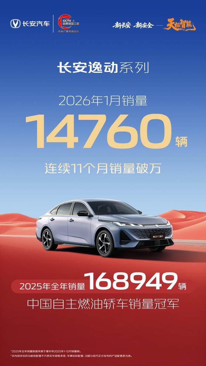 榮膺2025年自主燃油轎車銷量冠軍的逸動系列,2026年開年再領跑,1月銷售14,760輛,連續11個月銷量破萬。第四代逸動依托智慧新藍鯨動力、天樞智能座艙及越級空間,持續夯實其“全球智能家轎標桿”的地位,累計用戶突破190萬。