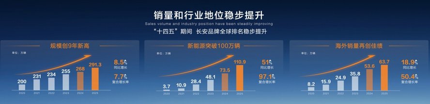 根據最新披露的轉型計劃,長安汽車明確提出到2028年實現中國品牌累計銷量4000萬輛、2030年年產銷目標500萬輛,其中新能源占比60%,海外占比35%,并躋身全球汽車品牌TOP10。這一戰略藍圖背后,是其新能源持續突破,2025年銷量達110.9萬輛,同比增長51.1%;全球化布局提速,未來三年將投放26款新品,覆蓋140余個國家和地區。這種“技術+市場”雙輪驅動的模式,為回購行動提供了堅實的業績支撐。