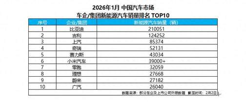 新年伊始,中國新能源汽車市場的競爭輪廓迅速顯現(xiàn),頭部車企之間的差距在1月銷量榜單中被進(jìn)一步拉開,分化格局愈發(fā)顯現(xiàn)。截至2月2日,根據(jù)部分車企及上市公司對外披露的數(shù)據(jù),比亞迪以超21萬輛的新能源汽車銷量位居行業(yè)首位,繼續(xù)穩(wěn)居中國新能源市場頭部位置,并在主要車企中拉開明顯差距。