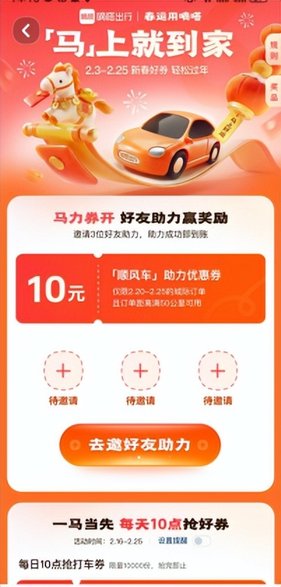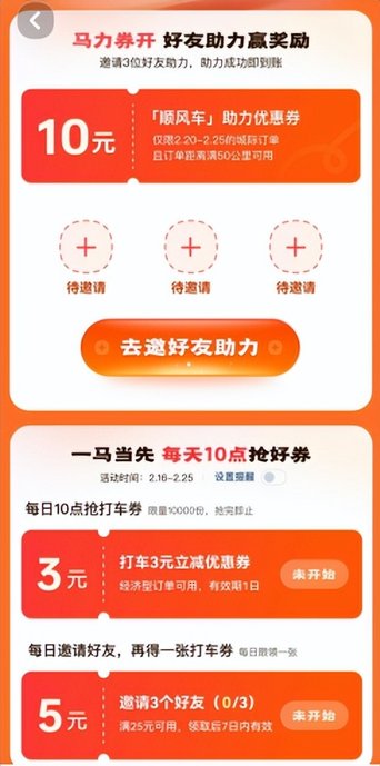 乘客的福利同樣豐厚。活動期間,每日都會上線無門檻打車券搶購活動,1萬份打車券先到先得,乘客登錄活動頁面就能參與。