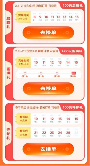 其中,666元圓滿禮內含33張接單現金券,單張最高返現50元,啟程禮、圓滿禮和守護禮中還包含市內及跨城接單獎勵券。