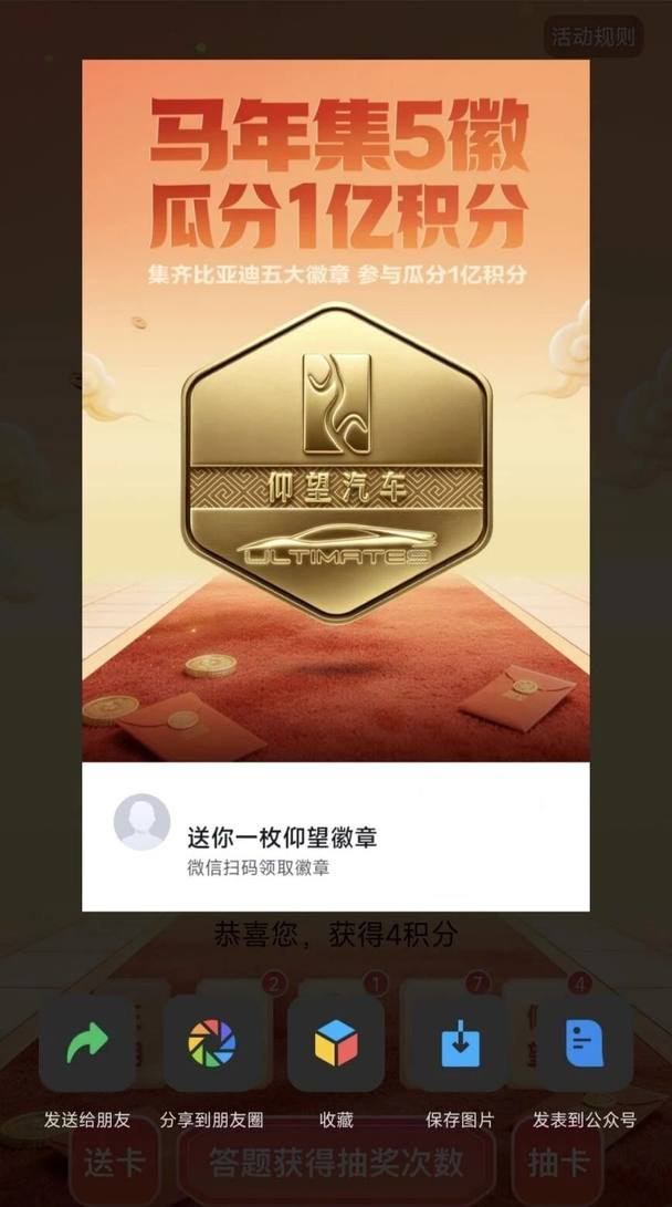 2026馬年春節在即,比亞迪寵粉再出新招,比亞迪APP「馬年集5徽 瓜分1億積分」活動將于2月13日-20日持續開展!作為比亞迪專門為用戶和粉絲打造的新春福利,活動主打一個“零門檻”躺玩,不管是不是比亞迪車主,都可以登錄比亞迪APP開啟集徽之旅。集齊王朝、海洋、方程豹、騰勢、仰望五大徽章,合成「比亞迪集團大徽章」,即可參與瓜分1億積分!互動度和體驗感直接拉滿!