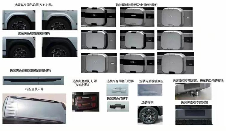 配置部分,新車標配全景天幕,激光雷達、拖車鉤等都支持選裝。同時,用戶還能根據喜好選擇車身同色/黑色輪眉、黑色側裙、紅色尾燈罩、不同風格輪轂、專屬裝飾件等,兼顧實用與個性化需求。