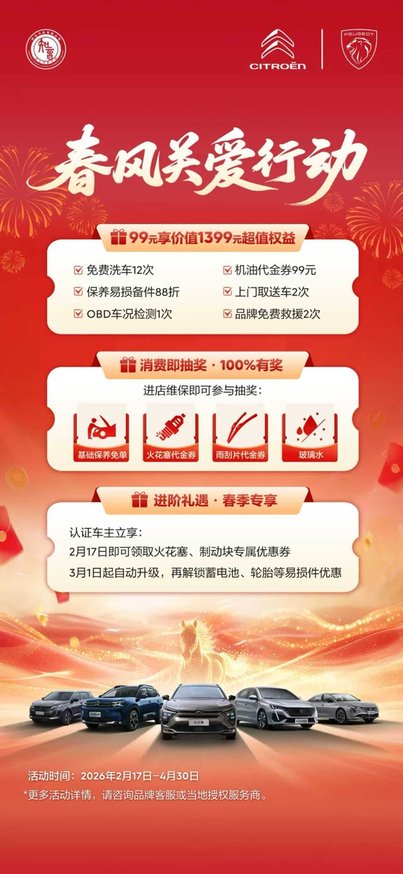 春節服務保障之外,東風標致與東風雪鐵龍還將自2月17日起開啟“春風關愛行動”。行動圍繞用戶春季養護需求,推出“99元享價值1399元權益”超享禮包、進店維保抽獎、保客進店禮遇等三重實用權益,涵蓋免費洗車、機油代金券、保養備件折扣、上門取送車、OBD車況檢測、品牌免費救援,以及輪胎、蓄電池專屬優惠福利等,其中多項權益有效期長達一年,將單次服務轉化為長期價值回饋,真正讓用戶在日常用車中省心省力、常享實惠。
