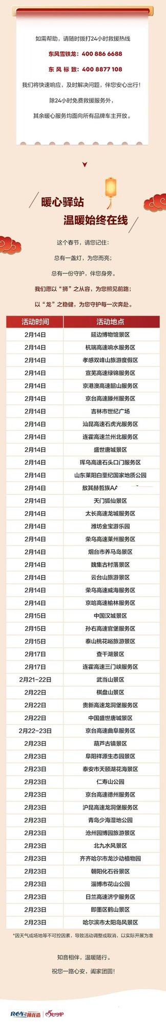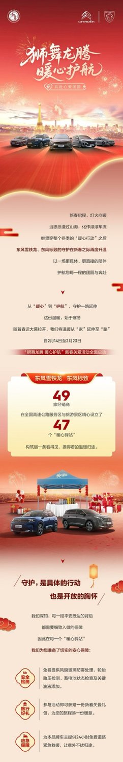 春運路上,平安是最深的牽掛。以“獅舞龍騰 暖心護航”為主題,東風標致與東風雪鐵龍聯動全國49家經銷商,自2月14日起在高速公路服務區及熱門景區設立47處“暖心驛站”,守護用戶的節日出行。