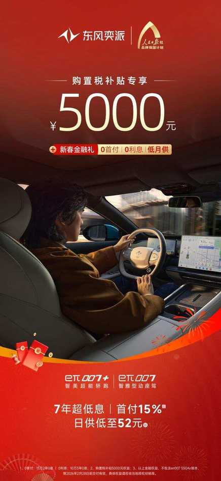 好車不等人,福利限時享!從產品到服務,從權益到體驗,東風奕派始終堅持以用戶為中心,回饋每一份信賴與選擇。開年購車正當時,除以上車型,“大美智能國民車”納米01也攜4000元購置稅補貼、5年0首付0利息的新春金融禮等權益而來,為消費者帶來更豐富的出行體驗。東風奕派這份“開年大禮”多重權益不斷加碼,此時入手新車正是最佳時機!別再猶豫,誠邀廣大消費者蒞臨東風奕派授權門店試駕品鑒,把心儀愛車帶回家,與家人朋友開啟不“奕”樣的美好新年旅程。
