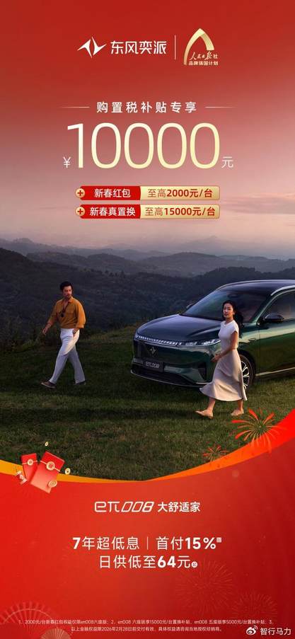 備受家庭用戶青睞的“大舒適家”奕派008,以“真滿配、真智能、真超值”全能產(chǎn)品力滿足用戶多元化需求。值新春之際,推出限時10000元專享購置稅補貼、至高15000元置換補貼等福利;此外,即日起至2月28日前,凡在東風奕派官方APP/小程序下訂奕派008的用戶,還可領(lǐng)取2000元“馬利”紅包,為新的一年增添“馬上有利”好彩頭!在金融端,還推出7年超低息、首付15%起、日供僅64元起購車政策,讓更多家庭輕松升級出行品質(zhì)。作為家庭SUV的價值標桿,奕派008以更高品質(zhì)、更具溫度的體驗,重新定義家庭出行新高度。