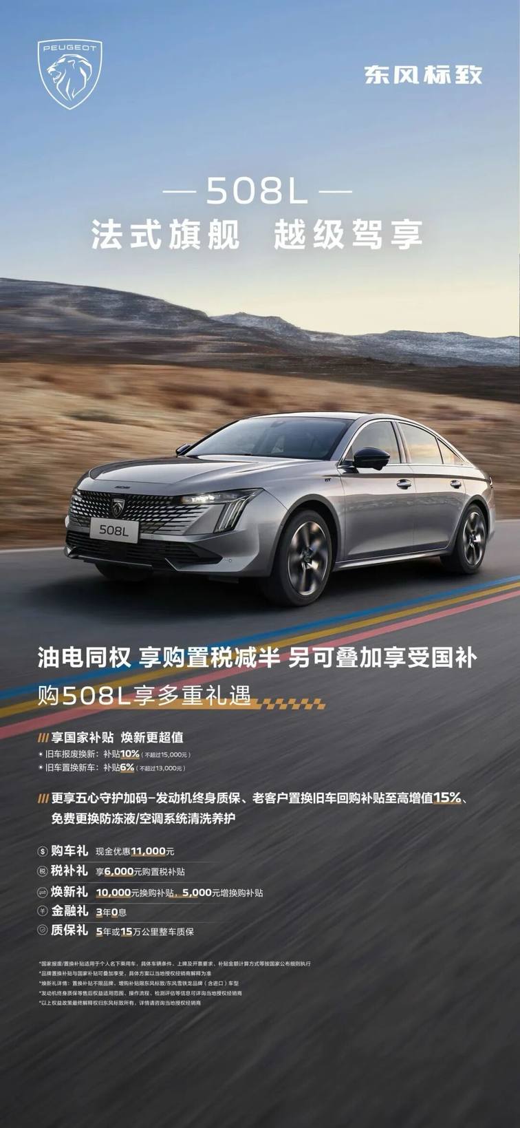 東風標致508L以越級產品實力詮釋法式駕控旗艦魅力,更帶來誠意十足的新春購車政策:購買508L可享至高4000元品牌直補,多重優惠疊加,進一步降低購車門檻。車型享“油電同權”,全面適用購置稅減半政策;同時可疊加現金優惠、購置稅補貼、置換/增購補貼,以及3年0息金融方案。更有5年或15萬公里整車質保、發動機終身質保等安心保障,全方位減輕購車與用車成本。