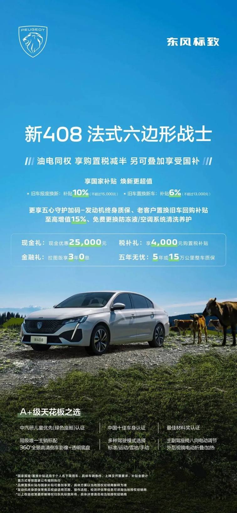 憑借出眾的產品實力與貼心配置,東風標致新408 更帶來誠意滿滿的新春購車政策:品牌直補至高3500元,并享25000元現金優惠與4000元購置稅補貼,新408龘龘款拉圖版更可享3年0息金融方案,全系享 5 年或 15 萬公里整車質保,疊加發動機終身質保政策,輕松降低購車用車成本。