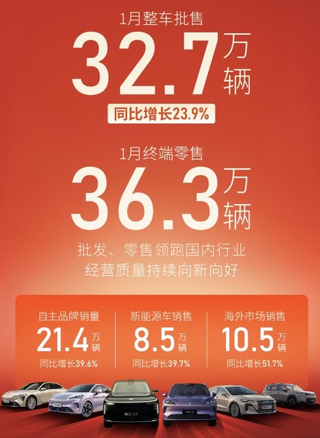 2026年第1個(gè)月,上汽新能源車銷售8.5萬輛,同比增長(zhǎng)39.7%。其中,智己汽車同比增長(zhǎng)66%;上汽乘用車2.8萬輛,同比激增576.9%;上汽大通0.4萬輛,同比增長(zhǎng)24.6%;上汽通用0.6萬輛,同比增長(zhǎng)316.1%;上汽通用五菱3.6萬輛。